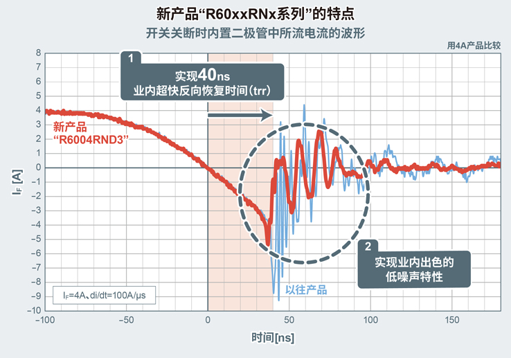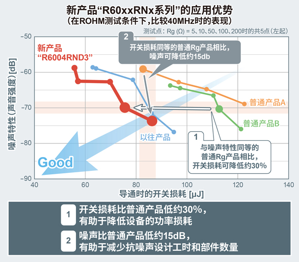 新产品不仅继承了PrestoMOS™的特点——超快反向恢复时间(trr*2)特性,同时还进一步降低了噪声。通过改进自有的Lifetime控制*3技术实现了40ns业内超快反向恢复时间,与普通产品相比,其开关损耗降低约30%,有助于进一步降低设备的功率损耗。另外,通过采用新开发的自有Super Junction结构,与普通产品相比,与反向恢复时间之间存在权衡关系的噪声也降低了约15dB(在ROHM测试条件下,比较40MHz时的表现)。新产品实现了业内优异的特性,有助于减少设备的抗噪声设计工时和部件数量。