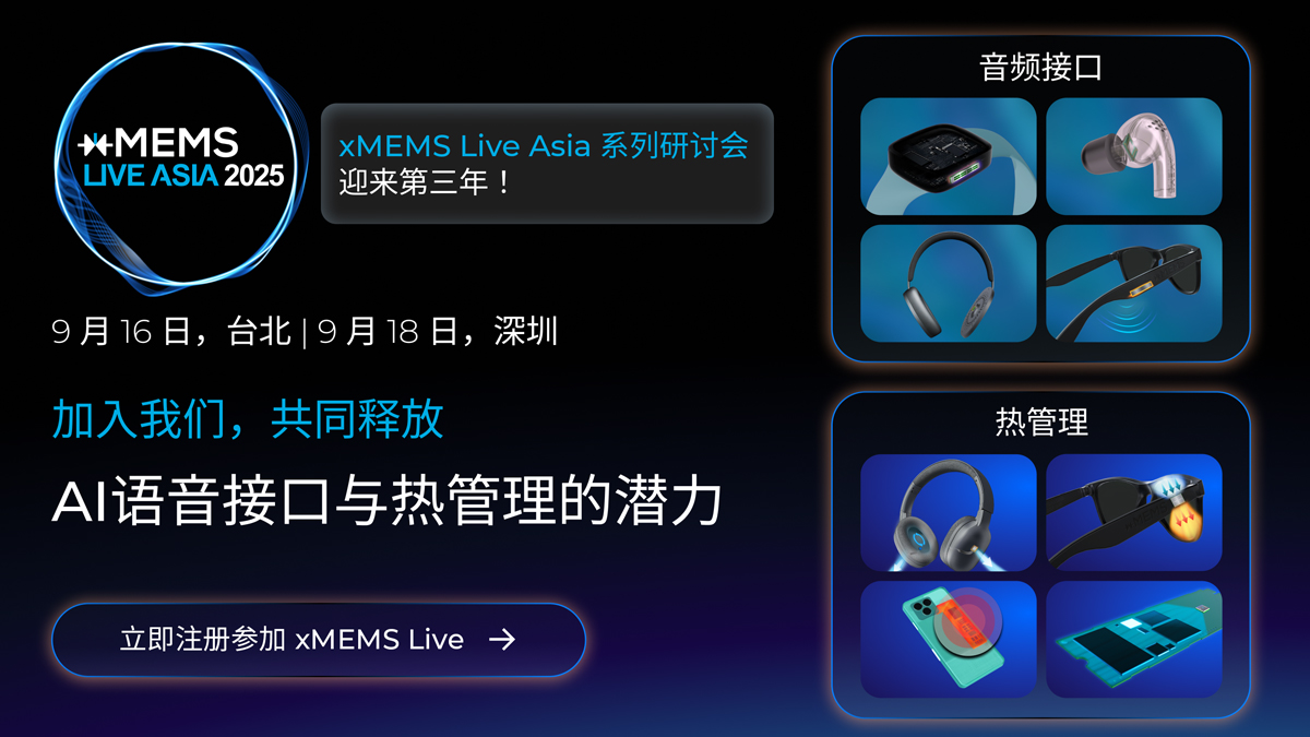 全球固态MEMS扬声器与微型热管理解决方案领导者xMEMS Labs今日宣布,其备受期待的xMEMS Live Asia系列研讨会将于9月16日在台北、9月18日在深圳举行。